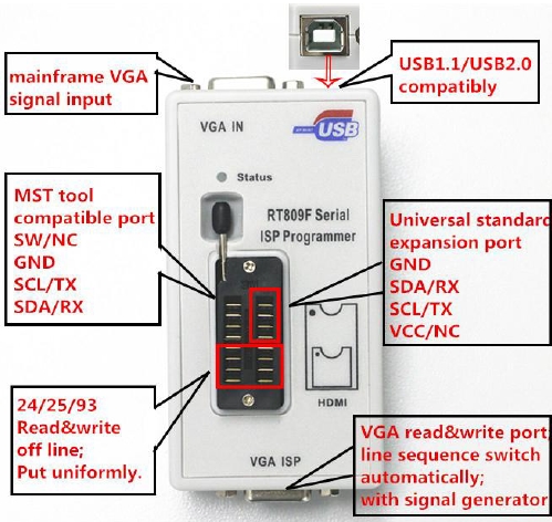 RT809H programmer is a kind of cost-effective, reliable and fast universal programmer series, suitable for all the computers or laptops based on Pentium IV processor or the better processors. When working, it can communicate with te USB2.0 fast port computer directly, with driver program inside software, which makes installing operation more convenient.