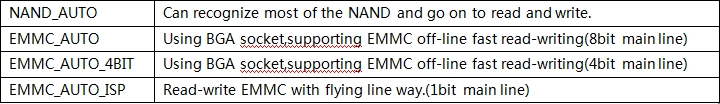 Support the mainstream device, including EEPROM、MCU、EC、SPI NOR flash、parallel NOR flash、SPI NAND, etc; NAND_AUTO can identify most of the NAND to read and write;